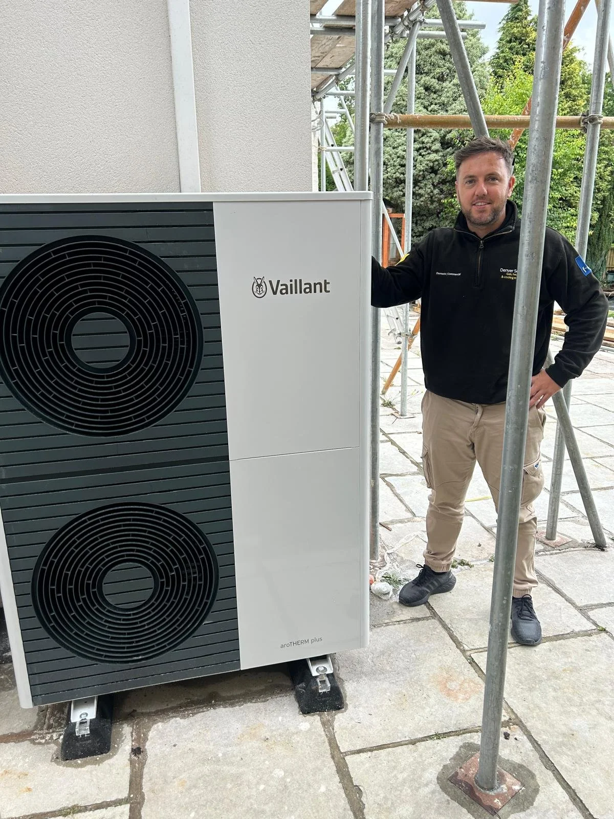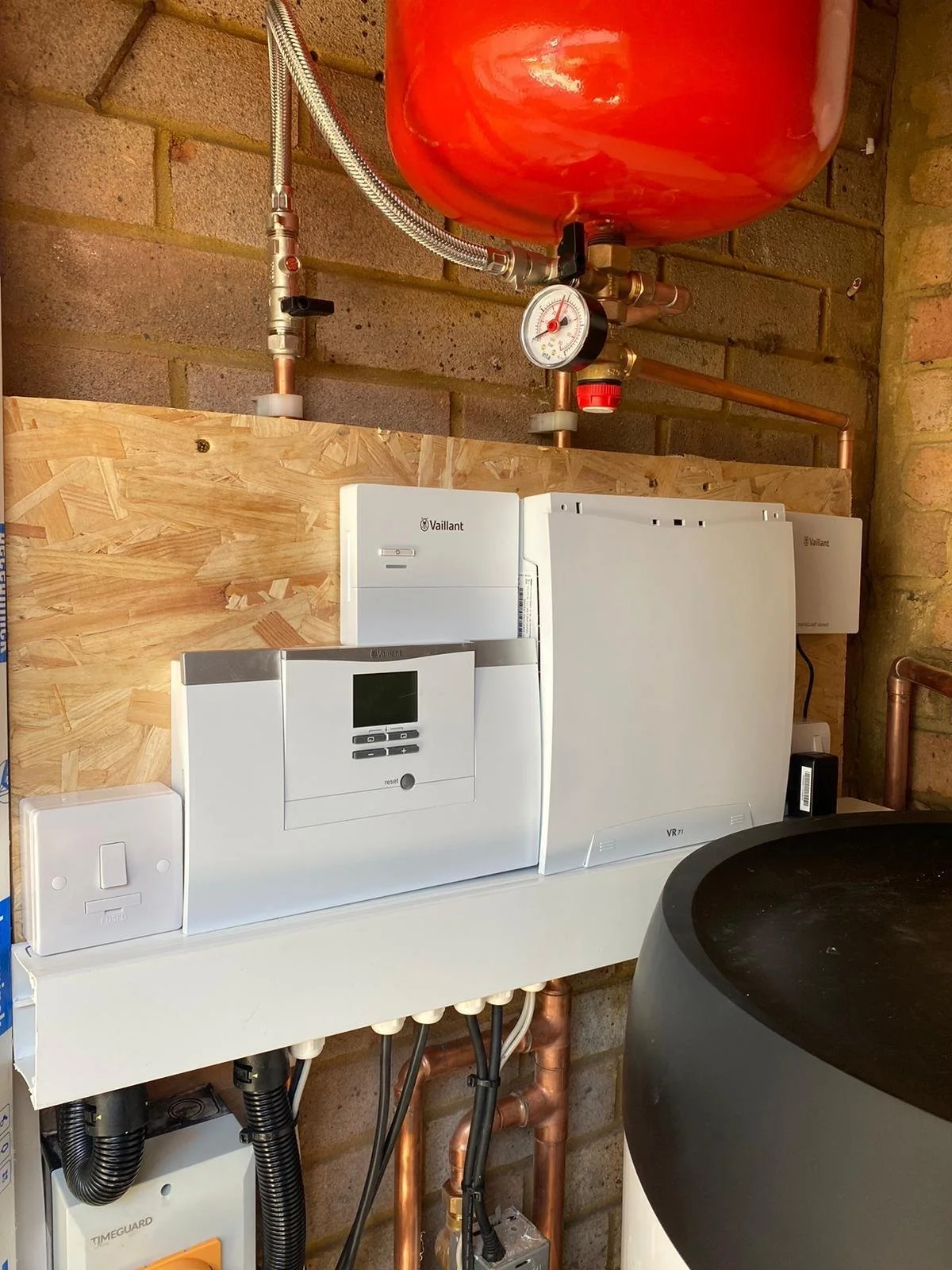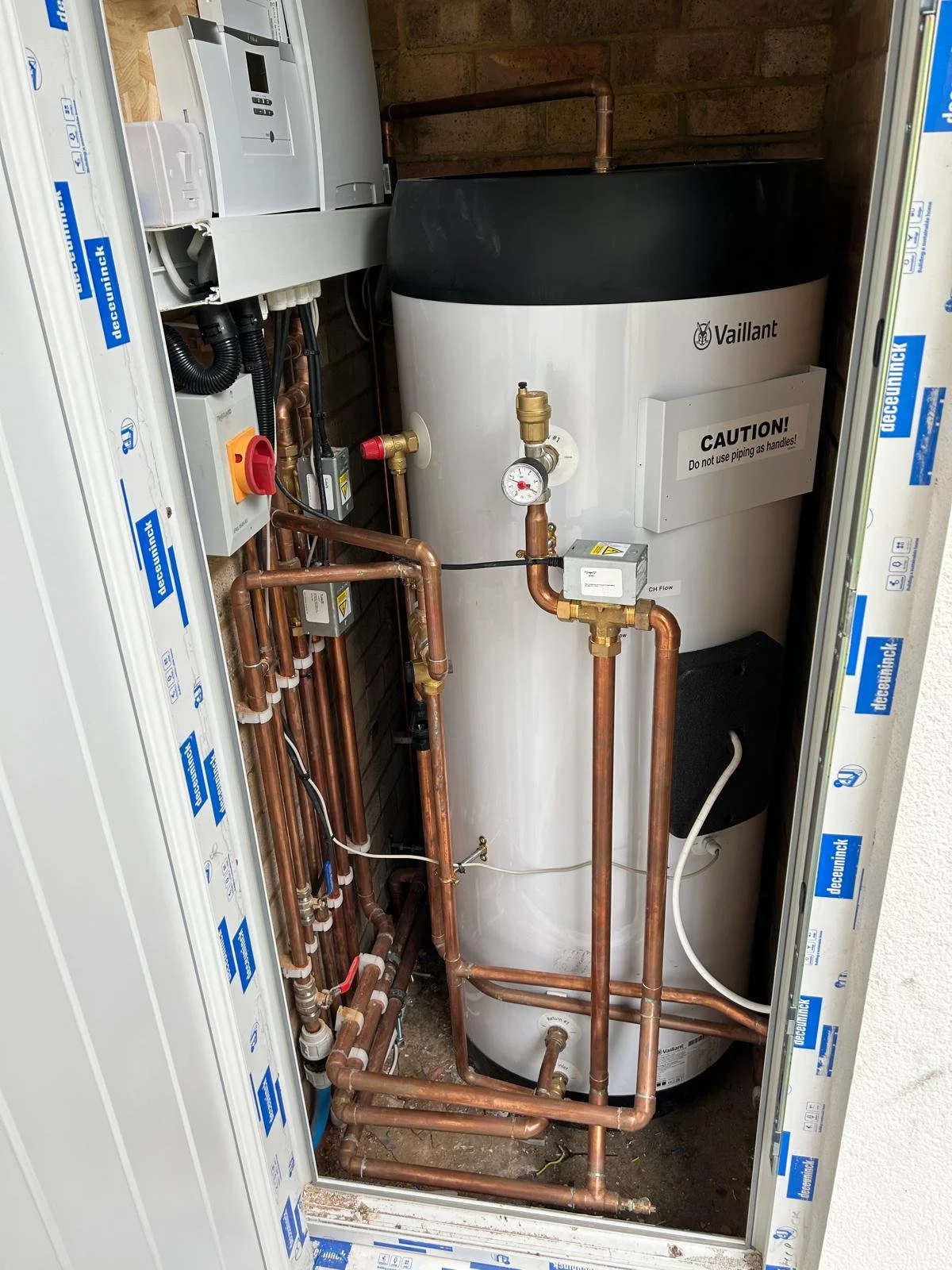 We installed a Vaillant aroTHERM air source heat pump (10kW) alongside a new hot water cylinder. This system was carefully selected to complement the underfloor heating being installed throughout the property, ensuring optimal performance and energy efficiency.
